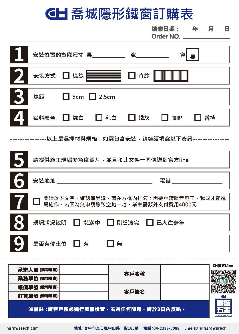請協助填寫訂製表,填寫完畢請將現場照片及本文件回傳至喬城LINE官方帳號 @hardwarech