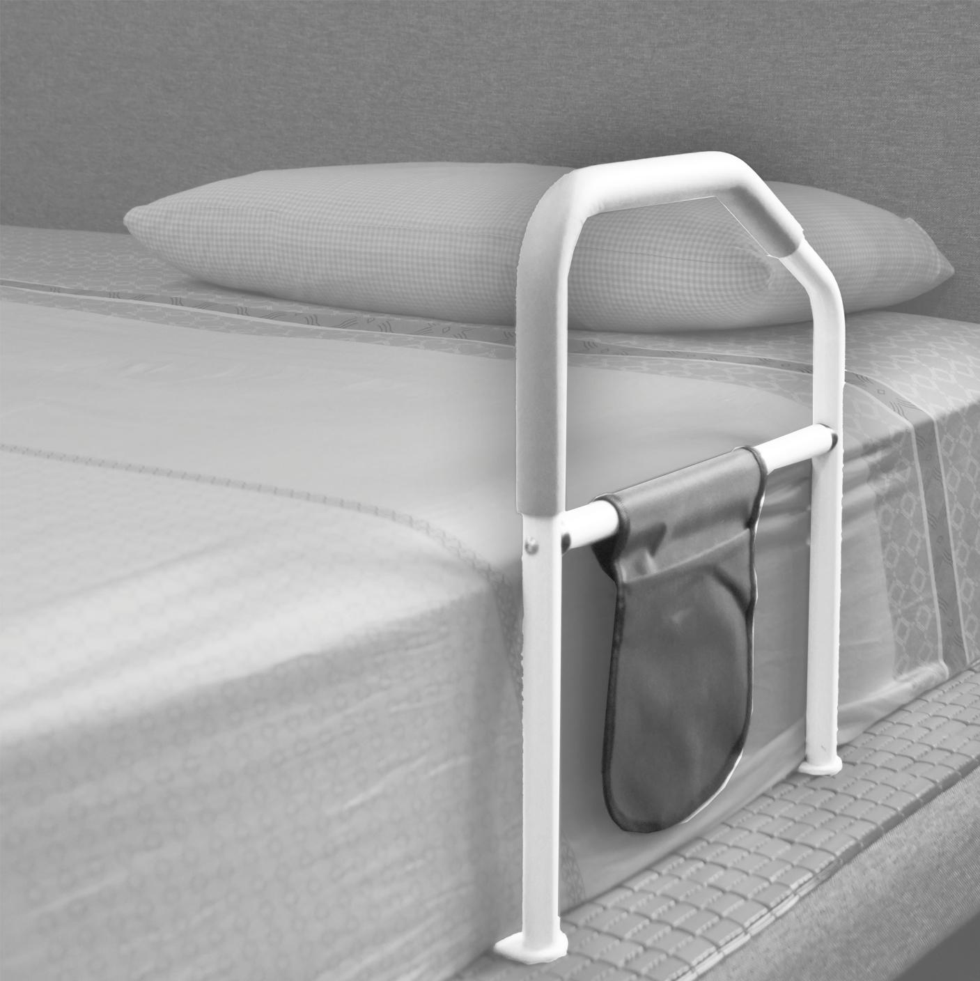 方形碳鋼鋼管噴白漆,配灰色PP扶手,扶手表面為粗糙面,加大抓握力度,防霉抗菌